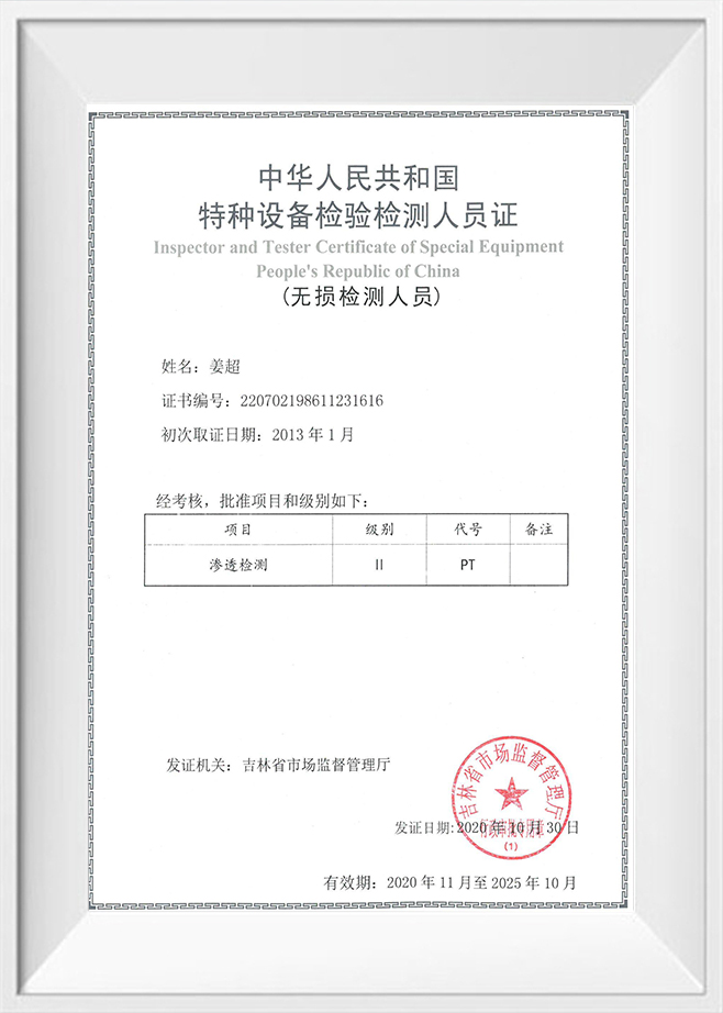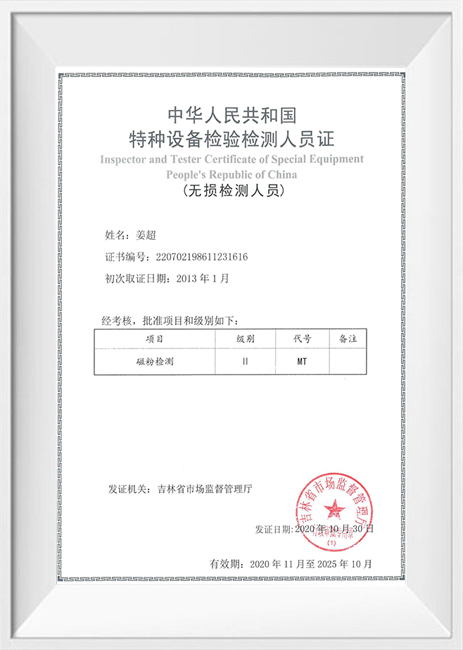 Certificat de inspector și tester al echipamentelor speciale Republica Populară Chineză
